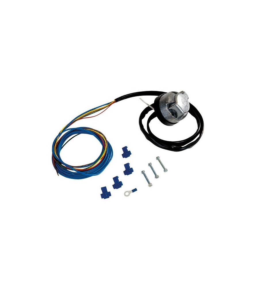 Composé de: 1 socle métal 7 plots, 1 capuchon arrière d'étanchéité, 5 connecteurs rapides bleus, 1 cosses à œillet Ø 6 mm, 1 porte fusible , 3 vis 5 x 35 mm, faisceau gainé, 1 câble 2mm² de 5 m pour branchement direct sur batterie.