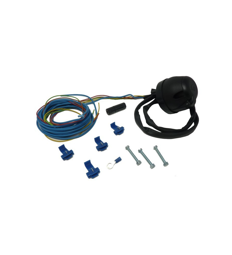 Composé de: 1 socle plastique 13 plots, 1 capuchon arrière d'étanchéité, 6 connecteurs rapides bleus, 1 cosses à œillet Ø 6 mm, 1 porte fusible , 3 vis 5 x 35 mm, faisceau gainé, 1 câble 2mm² de 5 m pour branchement direct sur batterie