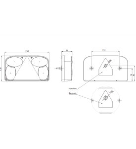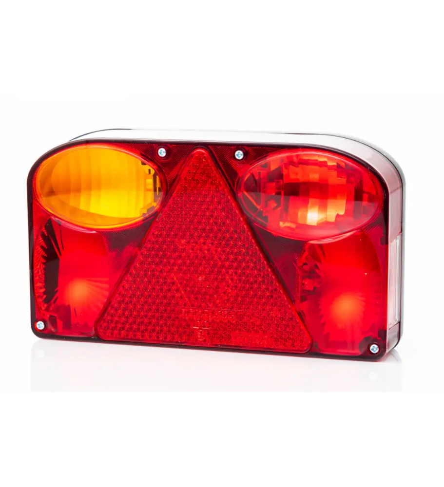 Feu arrière avec triangle, fonction antibrouillard et éclaireur de plaque, connecteur à baïonnette 5 broches, ampoules incluses.