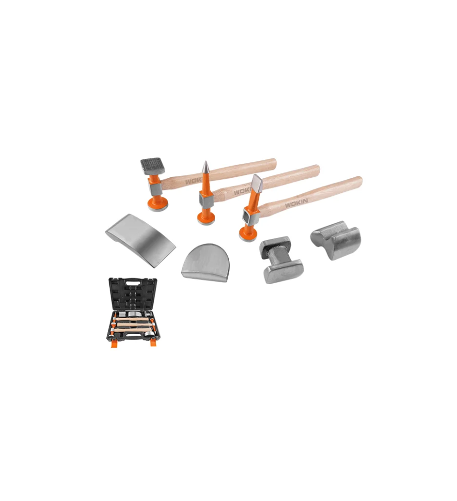Kit de formage pour carrosserie composé de 7 pièces incluant 3 marteaux et 4 tas. Conçu pour les professionnels, cet ensemble garantit précision et durabilité grâce à des manches en hickory et des têtes de marteaux en acier forgé.