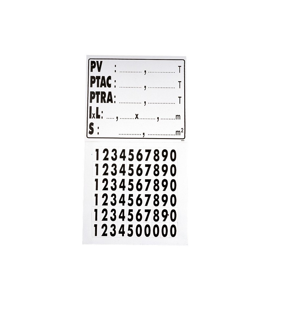 2. Installation Rapide : Livrée avec un ensemble de chiffres adhésifs, cette plaque peut être personnalisée directement par vos soins. Il suffit de décoller et coller les chiffres correspondant aux caractéristiques de votre remorque (poids à vide, poids total, dimensions), et l’étiquette est prête à être installée.