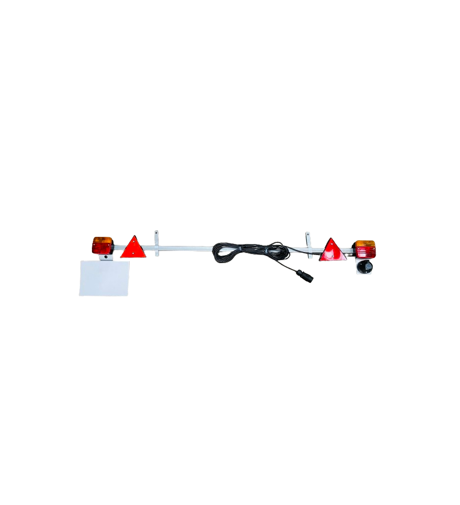 Rampe agricole avec 2 feux + ampoules, 2 triangles réfléchissants. Avec 2 pattes de fixations réglables et 1 support de plaque. Livré avec une plaque d'immatriculation vierge